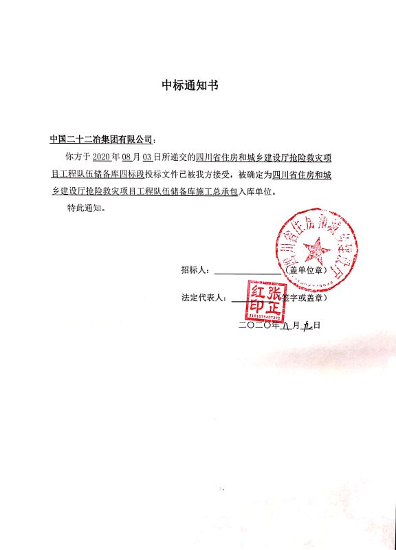 2020年8月9日,中國二十二冶集團有限公司成都分公司收到四川省住房和城鄉(xiāng)建設(shè)廳“四川省住房和城鄉(xiāng)建設(shè)廳搶險救災(zāi)項目工程隊伍儲備庫”項目中標(biāo)通知書,這標(biāo)志著成都公司正式進入四川省住房和城鄉(xiāng)建設(shè)廳搶險救災(zāi)項目工程隊伍儲備庫(施工總承包單位)。
