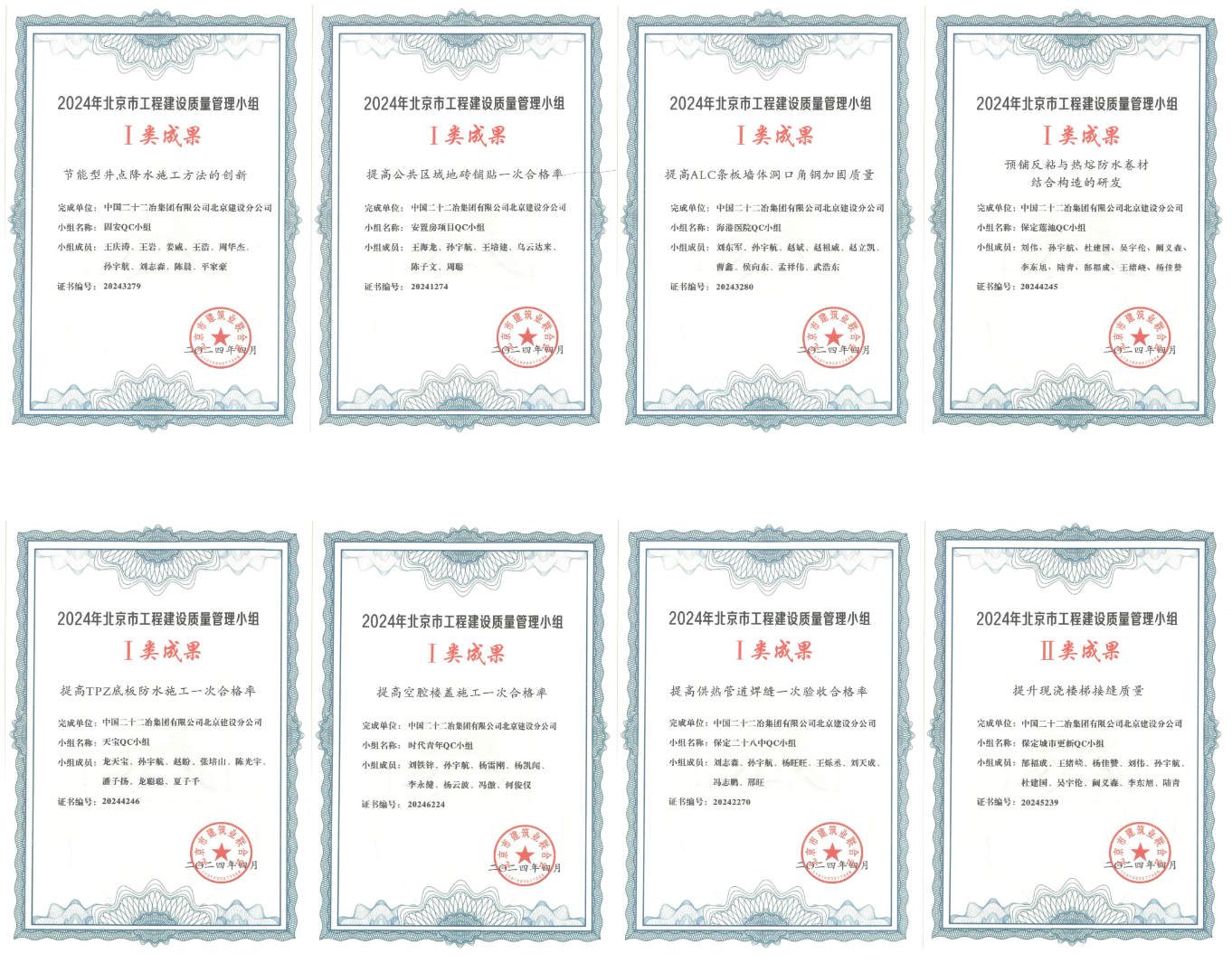 4月17日,在北京市建筑業(yè)聯(lián)合會組織的2024年度QC競賽活動中,崇建公司8項參賽成果全部入圍,最終獲得省部級一等獎7項,二等獎1項,時隔一年再次刷新了崇建公司在屬地化質(zhì)量管理活動競賽中的最好成績,其中一等獎獲獎數(shù)量超過了以往屬地化競賽活動一類獎項的總和,成果總體水平提升明顯。