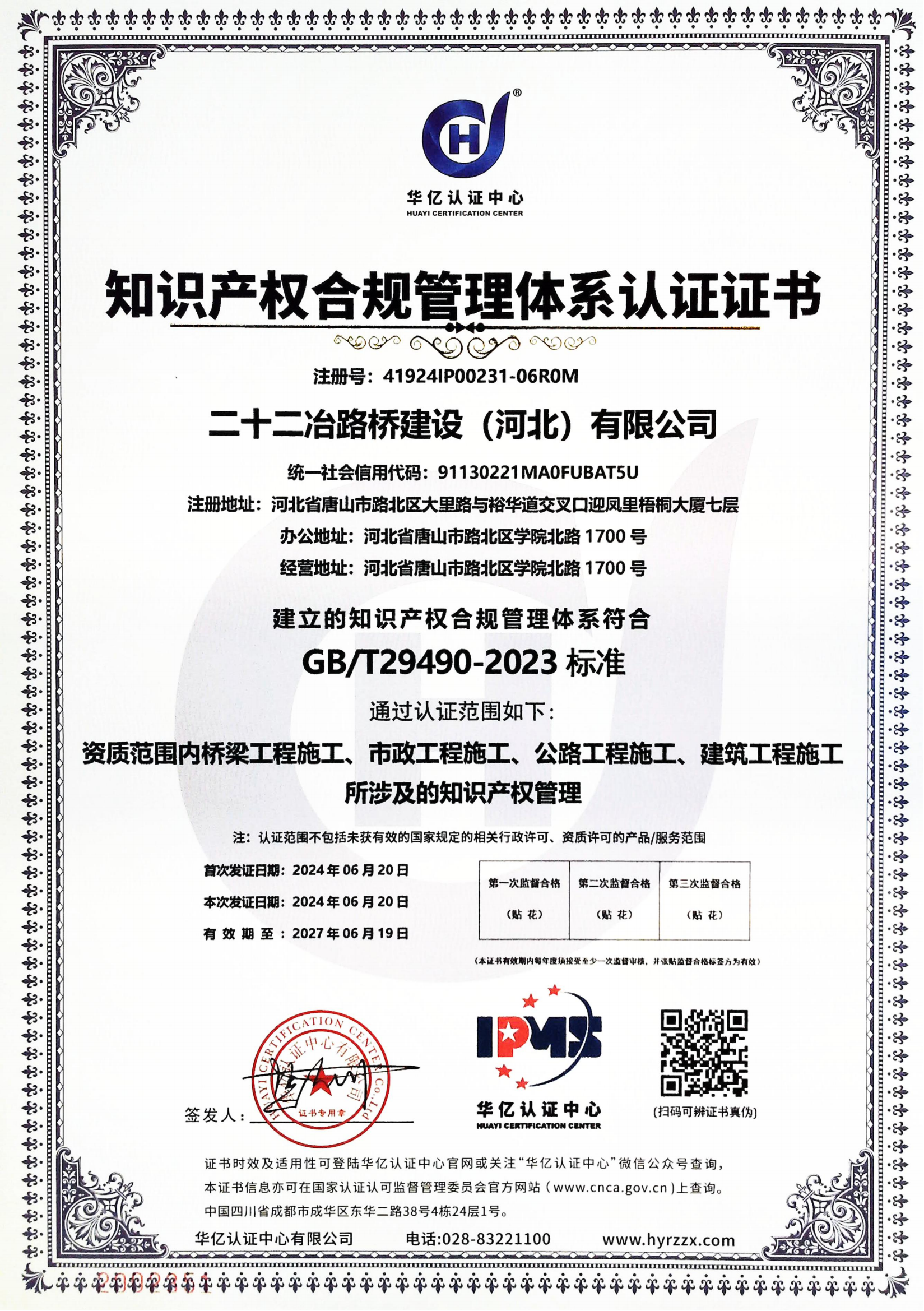 近日,二十二冶路橋建設(shè)(河北)有限公司知識(shí)產(chǎn)權(quán)貫標(biāo)成功,獲得“知識(shí)產(chǎn)權(quán)管理體系認(rèn)證證書”。
